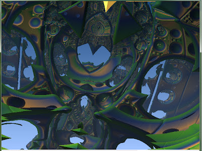 The lower you go with those two values, the longer the render is going to take. My first render of the above image in Mid mode took only a few seconds, whereas the above one took around 12 minutes. So if you have some awesome fractal image loaded, at 4000x3000 resolution, and try rendering it with Raystep Multiplier and Stepwidth limiter at 0.02, expect to wait a very long time for your render! ... I tried it, and ended up with something that took 21 hours!