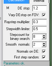 Aha! Much better, even if not good yet. So now, have you noticed the numbers changing in the little "Calculations" tab every time you changed from one mode to another? From Preview to Mid, for example. I decided I wanted to try changing them myself instead of choosing "High" .. So I kept it on "Mid" and just changed the Raystep multiplier and Stepwidth limiter values (see image below).