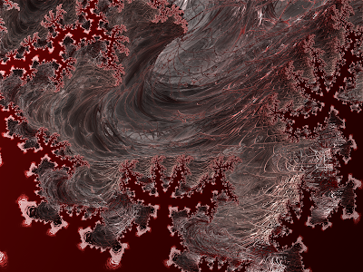 As for the creational process... Well, as already illuded to, most of what I've done so far has been with a lot of frustrated perseverance, and luck. Looking for a great fractal form can take forever... And then, suddenly, something will pop up and you can spend hours saving location after location for possible use later. And hours more playing around with the colours of each one. (Also remember, always render your fractal to the size you want it before perfecting the colours. If you do the colours first, they will change dramatically when rendering up.)